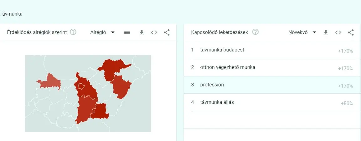 Vagyis munka, amelyet otthonról lehet elvégezni. Ezt keresik leginkább a magyarok és ha megnézzük, akkor itt is látható, hogy az ország legnagyobb részében az otthoni munka egyáltalán nem indukál kereséseket; míg Budapesten és Veszprém megyében érdeklődnek ez iránt a legtöbben.