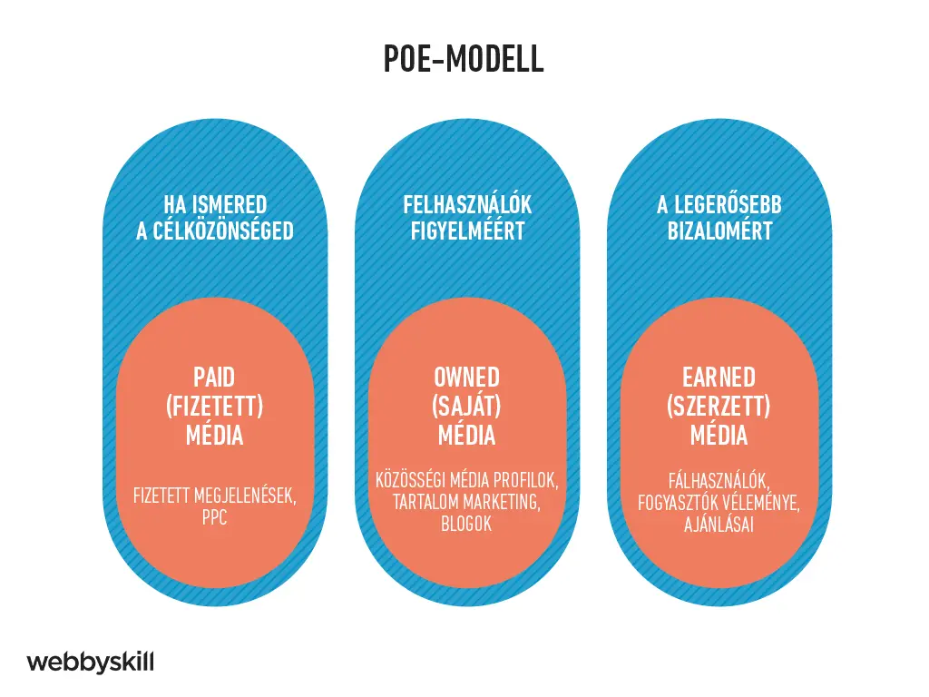 Az online marketinget több módon is kategóriákra bonthatjuk, attól függően, hogy milyen szempontokat veszünk figyelembe. Ha például számodra fontos, hogy vásárolt vagy nem vásárolt forgalom érkezik az oldaladra – mert például vállalkozásodnak még nincs pénze marketing kampányokra -, akkor a POE modell szerint fogod rendszerezni a marketing eszközöket. A POE egy betűszó, amely a vásárolt (Paid), saját (Owned) és szerzett (Earned) szavak rövidítéséből keletkezett.