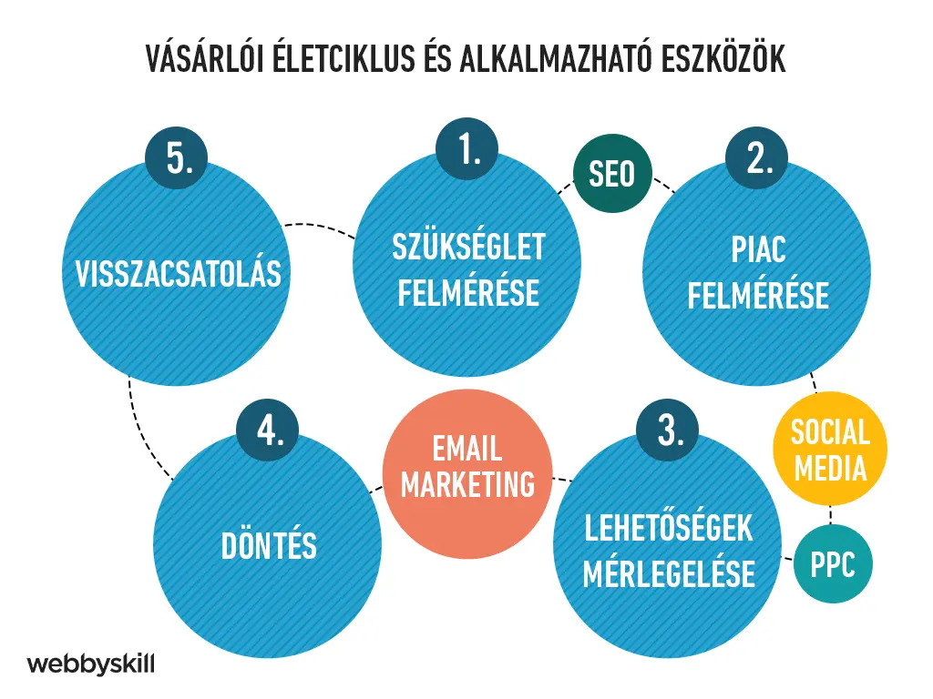Fontos ismerni a vásárlói életciklust, hogy tudd, mikor melyik online marketing eszközt kell bevetned. Hagyományosan 5 szakaszból áll: